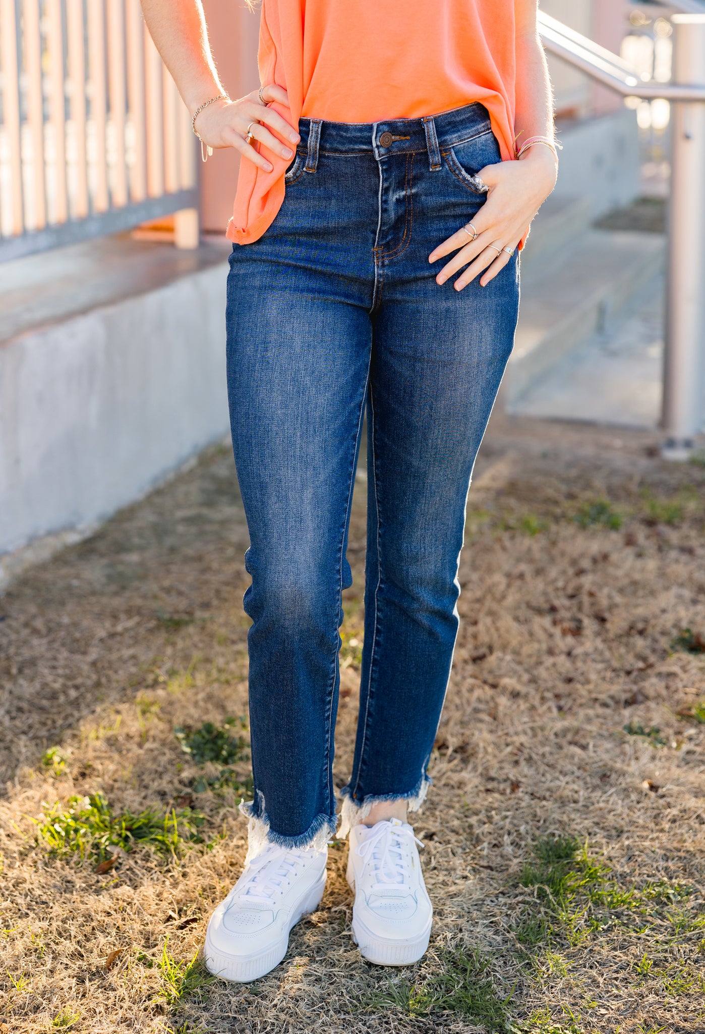 "Upgrade your denim game with Chesney Jeans by Vervet! Featuring a dark wash, high rise fit, and stretchy material, these ankle flare jeans exude effortless style. The uneven frayed hem adds a touch of edge to any outfit. Make a statement with Chesney Jeans!"