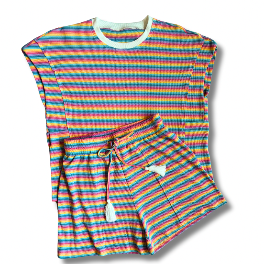 Experience endless summer days in this colorful 2 piece set! With shorts featuring a tassel tie and a short sleeve top, you'll stay cool while looking stylish. Perfect for any casual occasion, this set will have you ready to soak up the sun in no time.
