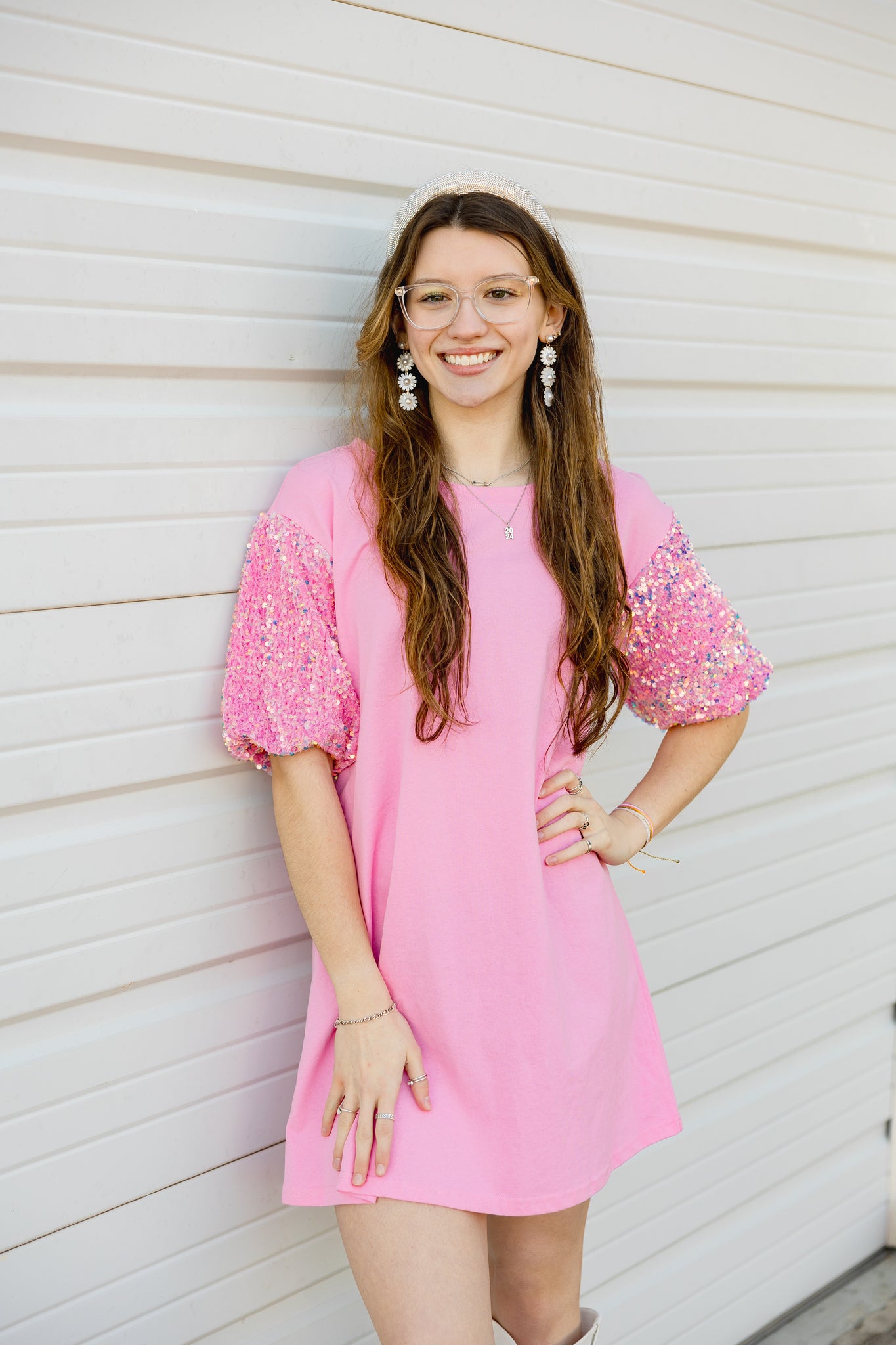 "Add a touch of sparkle and love to your wardrobe with our In Love Dress. Featuring sequin puff sleeves and a playful pink tshirt dress, this dress is perfect for any occasion. Get ready to turn heads and express your unique style with this fun and flirty piece."