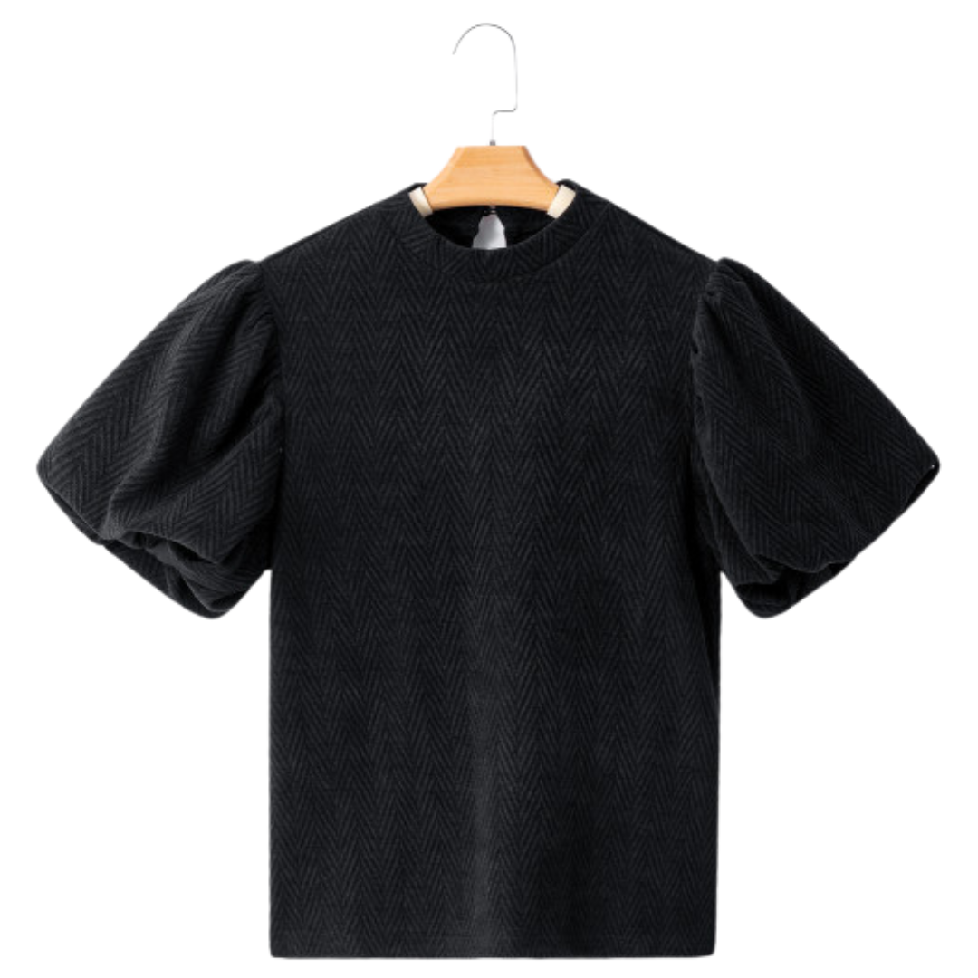 Get ready to turn heads in The Goodness Gracious Top! This playful top boasts black, textured fabric, puff sleeves, and a mock neck for a touch of edginess. Stand out from the crowd and feel confident in this unique and stylish piece.